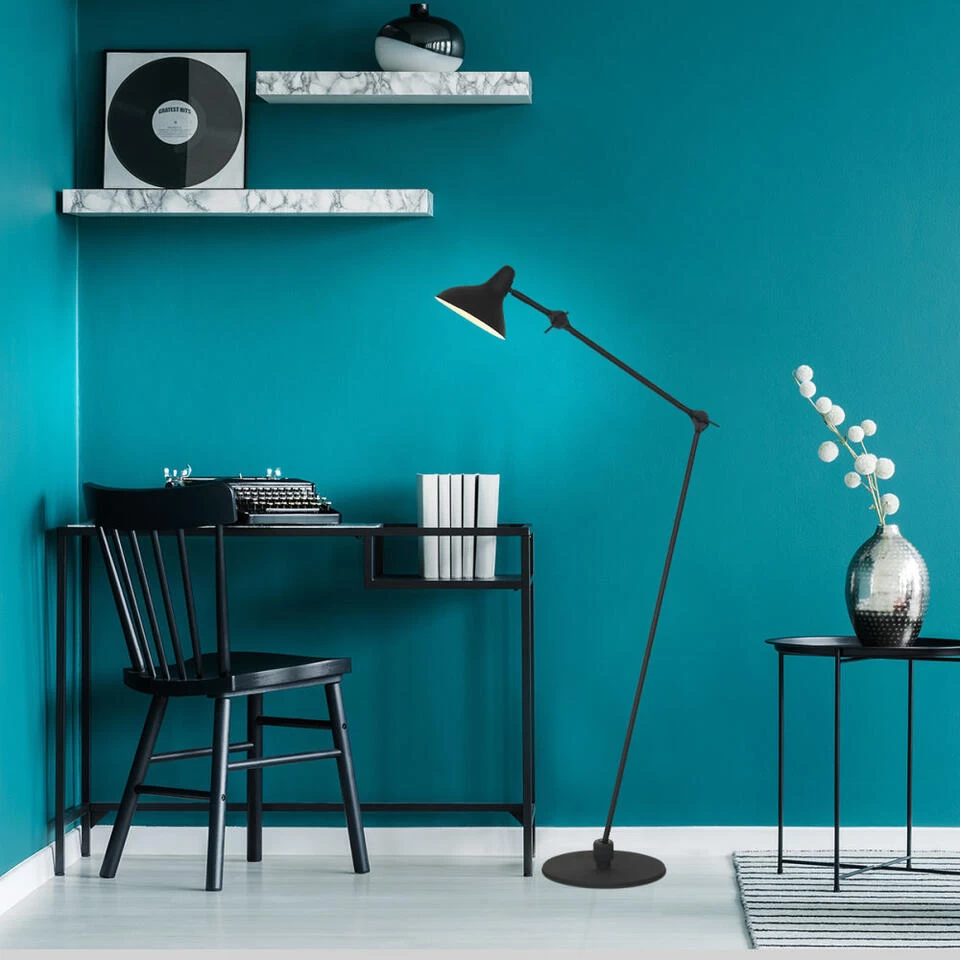 Retro vloerlamp uit de Kasket serie van het merk Anne Light & Home. De vloerlamp is vervaardigd uit metaal met een zwarte poeder coating en de kap is wit aan de binnenkant. De lamp is kantelbaar en draaibaar, hierdoor kunt u zelf bepalen waar u het licht op schijnt. De kap heeft een diameter van 18,5 centimeter en is voorzien van een E27 grote fitting, geschikt voor alle type lichtbronnen tot maximaal 40 watt. De vloerlamp is verstelbaar in hoogte van minimaal 110 centimeter tot maximaal 150 centimeter, de diameter van de voet is 30 centimeter. Wordt inclusief snoer geleverd van 200 centimeter met voetschakelaar.