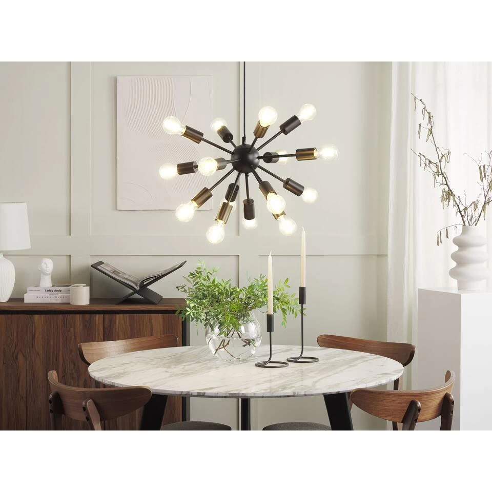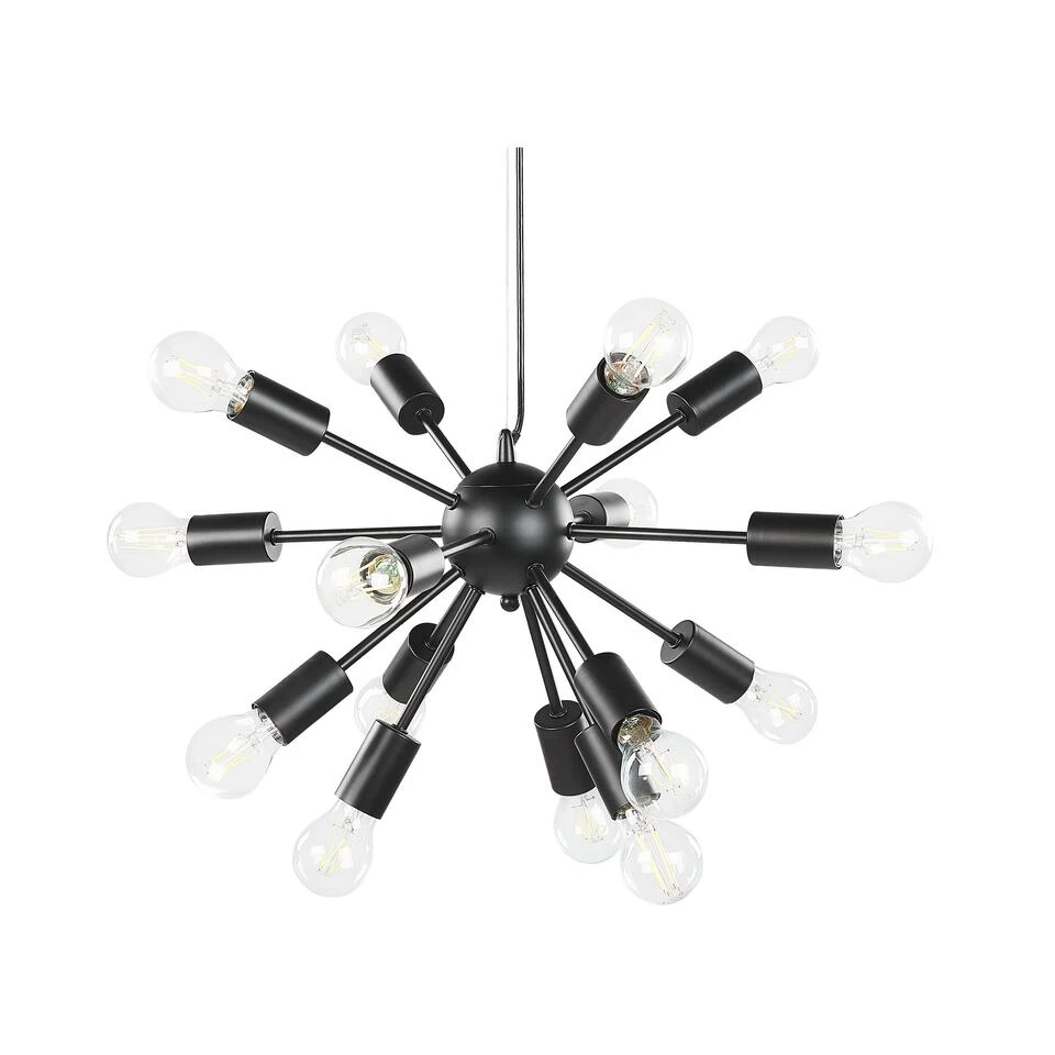 Moderne Plafondlamp. Verfraai je woonkamer of eetkamer met deze mooie moderne hanglamp. De lamp is gemaakt van ijzer en heeft een zwarte afwerking, die een minimalistische touch geeft aan elk interieur. In het karakteristieke ontwerp passen 15 decoratieve gloeilampen, waardoor zijn stijl tot recht komt, terwijl de kamer volledig wordt verlicht.