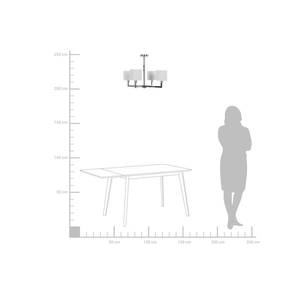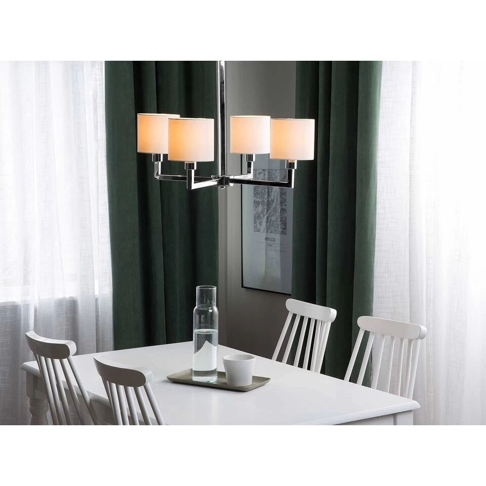 Klassieke plafondlamp met 4 lampen. De klassieker onder de lampen – deze hanglamp heeft vier ronde stoffen lampenkappen in wit, waardoor een aangenaam licht straalt. De glanzende, zilvermetalen constructie maakt deze lamp tot een universeel accessoire voor elke leefruimte en past zich perfect aan aan verschillende inrichtingsstijlen.