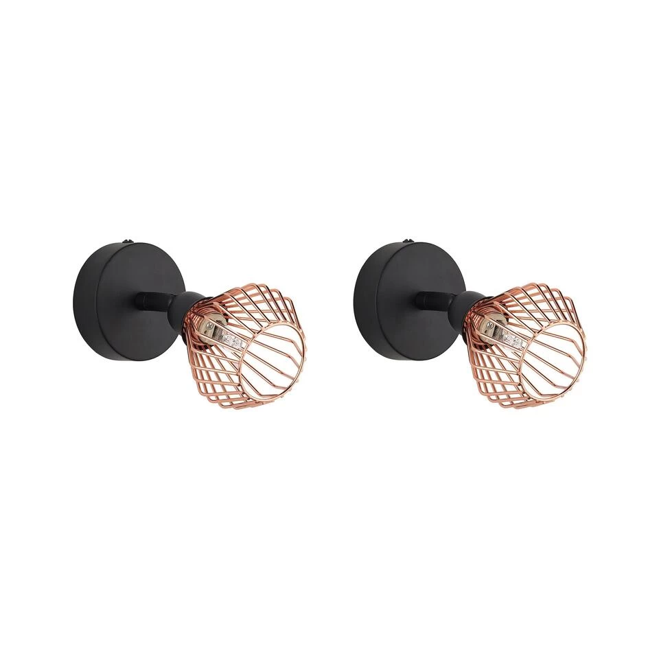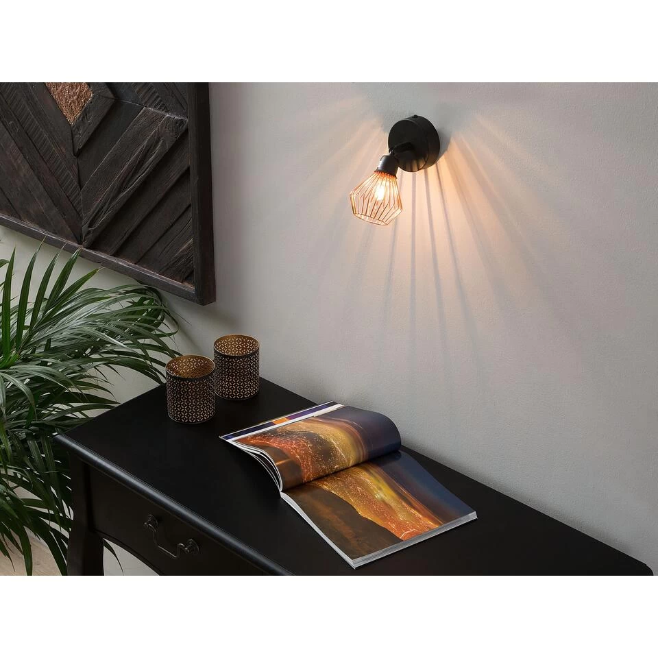 Verstelbare koperkleurige wandlamp . Deze wandlamp, in een set van 2, van zwart metaal en koper wordt al snel een decoratief element op zichzelf. De gevlochten, ronde kap van de wandlamp geeft de kamer een warm en helder licht voor een gezellige sfeer. Of het nu in de woonkamer, op kantoor of in de hal is, deze wandlamp maakt je interieur compleet.