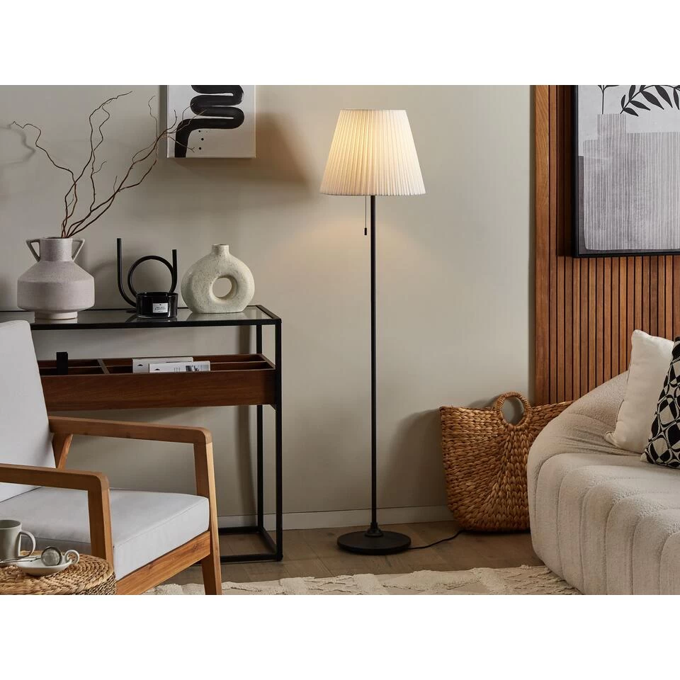 Klassieke vloerlamp woonkamer. Maak de sfeer van je interieur helemaal compleet met deze eenvoudige, maar chique staande lamp. De stoffen kap creëert een mooi en mild sfeerlicht dat ’s avonds de hele kamer prachtig zal verlichten. De metalen voet garandeert stabiliteit en de trekschakelaar voegt er en elegante toets aan toe.