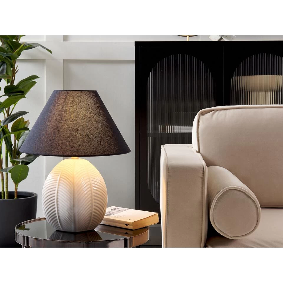 Stijlvolle tafellamp met siervoet. Maak je woon- of slaapkamer compleet met een elegante tafellamp die ook nog eens een mooi accent vormt. Een gebeeldhouwde basis, met patronen die op bladeren lijken, voegt een natuurlijk karakter toe aan het stuk. De crèmebeige kleur van de onderkant van het accessoire contrasteert perfect met de zwarte tint van de lampenkap. Het linnen materiaal en de kegelvorm zorgen voor diffuus licht, wat ideaal is om ’s avonds te lezen.