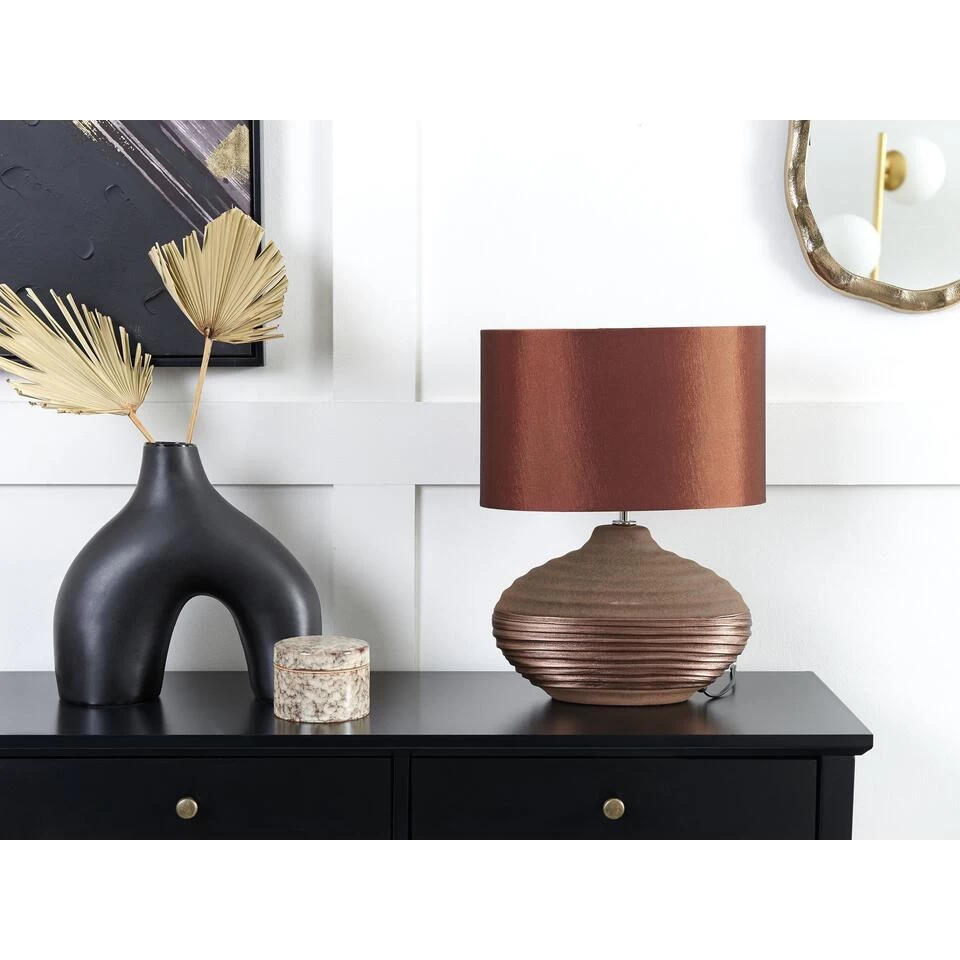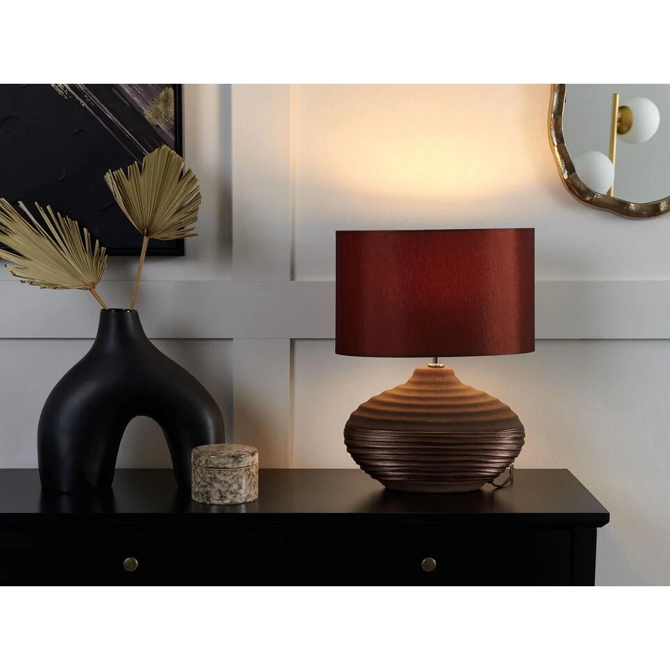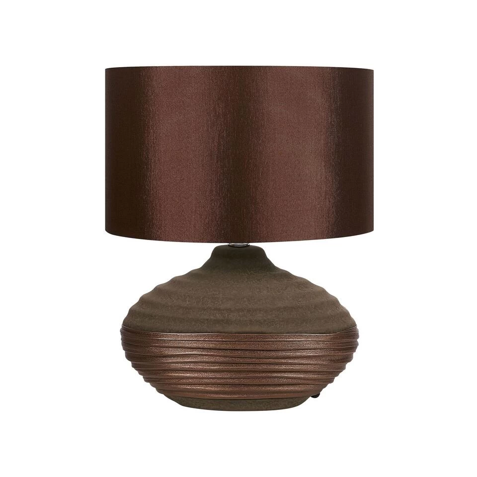 Trommelvormige, bruine porseleinen tafellamp. Deze decoratieve, bruine lamp is ideaal als nachttafellamp, maar kan ook in de woonkamer als stijlvolle lichtbron of leeslamp worden gebruikt. De ovale lampenkap van de tafellamp is van hoogwaardig, grijs kunstzijde. De elegante porseleinen lamp is een echte blikvanger in elke ruimte.