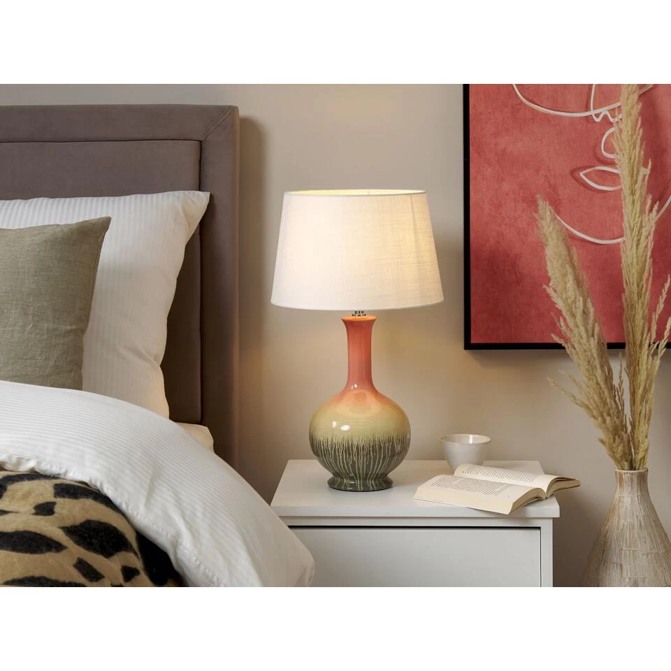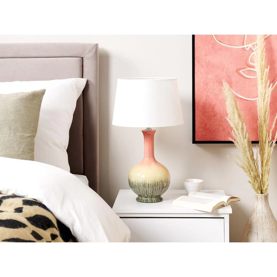 Meerkleurige lamp met keramische voet. Deze tafellamp past zeker in diverse, kleurrijke interieurs dankzij de unieke voet met een combinatie van roze, beige en groene tinten. Het hoeft niet dagelijks te worden schoongemaakt, omdat het is gemaakt van onderhoudsarme materialen. Linnen kap gaat het licht warm en aangenaam maken, dus de lamp kan naast het bed of in je woonkamer worden geplaatst voor het beste effect.
