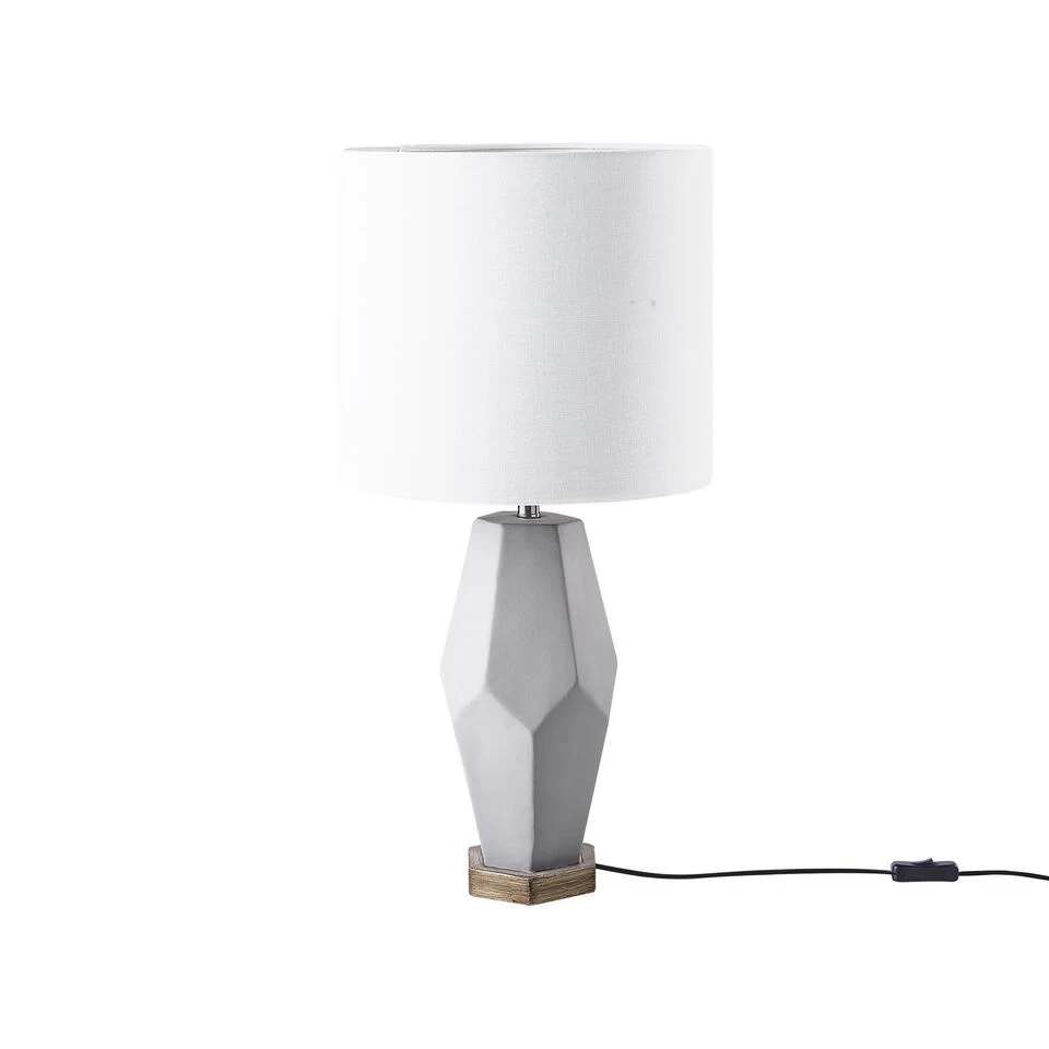 Moderne tafellamp met geometrisch design. Deze tafellamp verfraait je woonkamer en brengt een nieuwe flair in. De lampenkap is gemaakt van hoogwaardig crèmekleurig linnen en biedt veel indirect licht voor een aangename sfeer. Bovendien ziet de modieus ontworpen basis op het voetstuk in betonlook er bijzonder elegant en stijlvol uit.