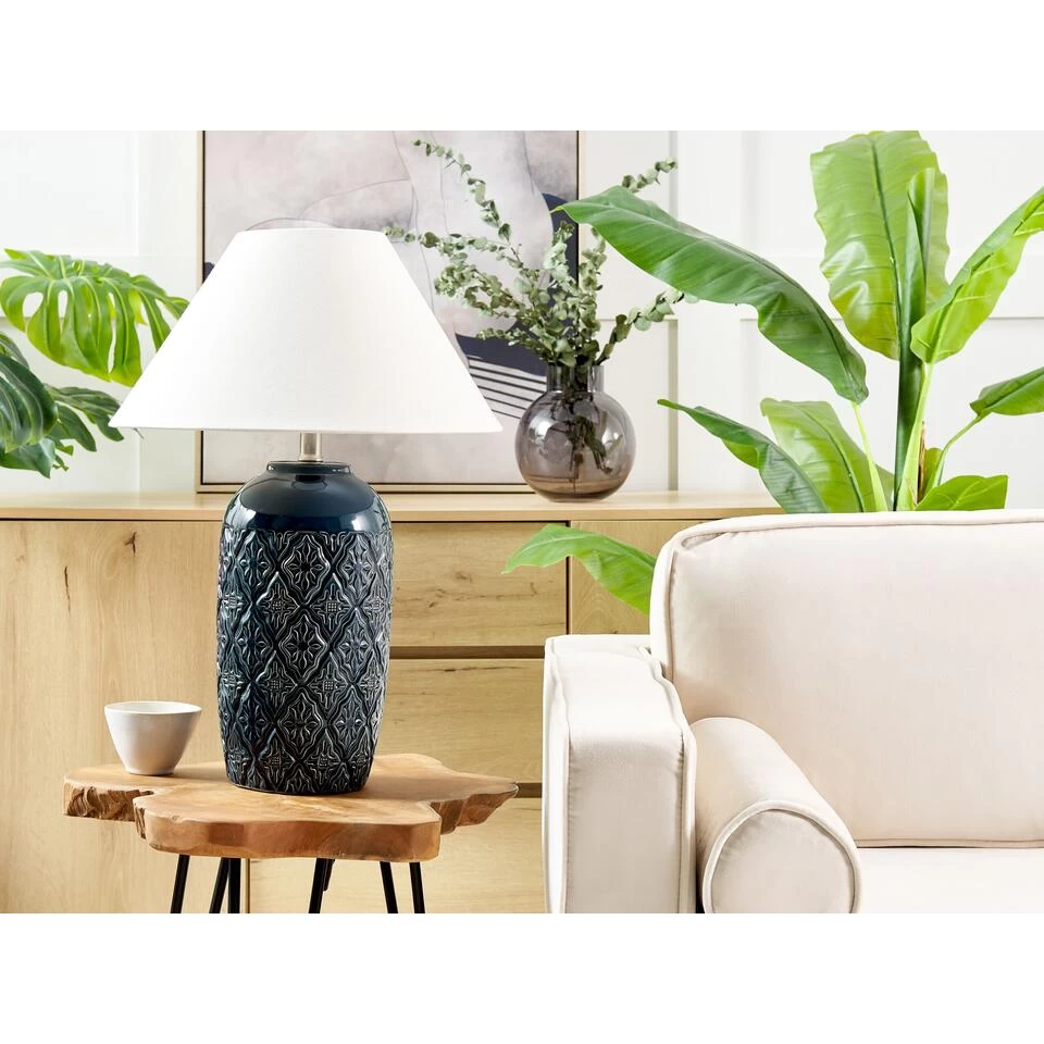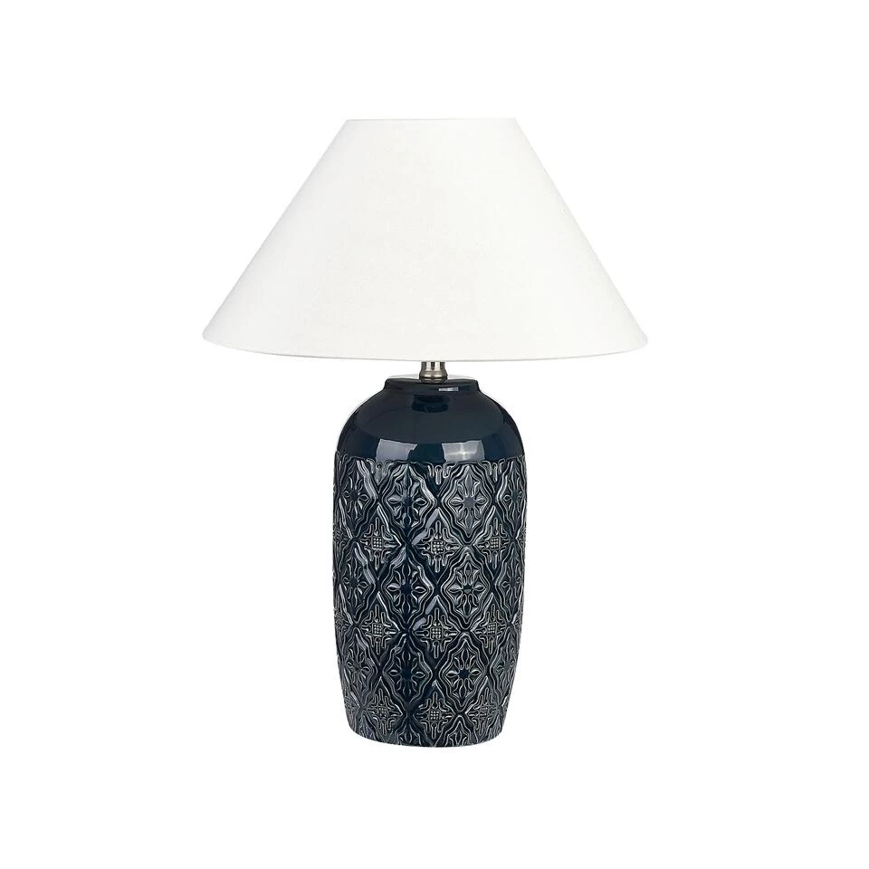 Stijlvolle tafellamp met siervoet. Maak de inrichting van je woon- of slaapkamer compleet met deze functionele, maar ook uiterst decoratieve lamp. De keramische basis is zeer stabiel en het patroon dat zichtbaar is op het oppervlak geeft het stuk een uniek karakter. De contrasterende kegelvormige lampenkap is gemaakt van linnen, wat garant staat voor een subtiel en aangenaam licht dat het lezen in de avond zeker aangenamer zal maken.