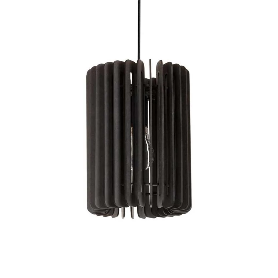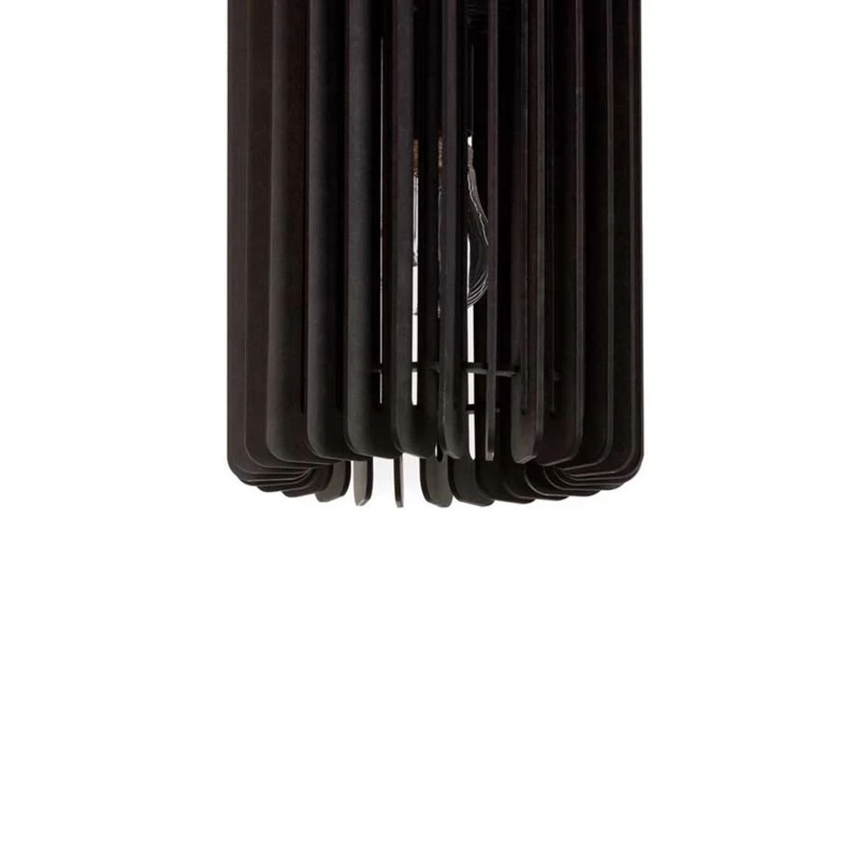 Deze leuke kleine hanglamp van hout geeft een mooi effect door het licht wat door de houten latjes probeert te ontsnappen. Geschikt voor een E27 lichtbron van maximaal 25 Watt (excl.). Deze Edge hanglamp is 19,5 cm breed en de kap heeft een hoogte van 27 cm. De totale hoogte is 135 cm en het meegeleverde zwarte stoffen snoer is simpel in te korten. Kleur: zwart hout.