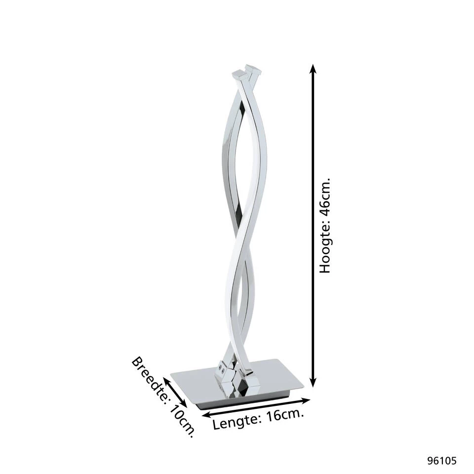 De EGLO Lasana 2 is een tafellamp gemaakt van staal met aluminium. De lamp heeft een chromen afwerking met een hoogte van 44,5cm. De lamp heeft twee geïntegreerde LED modules met een wattage van ieder 5W. De lamp geeft warm wit licht (3000K) en is niet dimbaar. De lamp is voorzien van een snoerschakelaar. De strakke tafellamp Lasana 2 past goed in een modern interieur.
