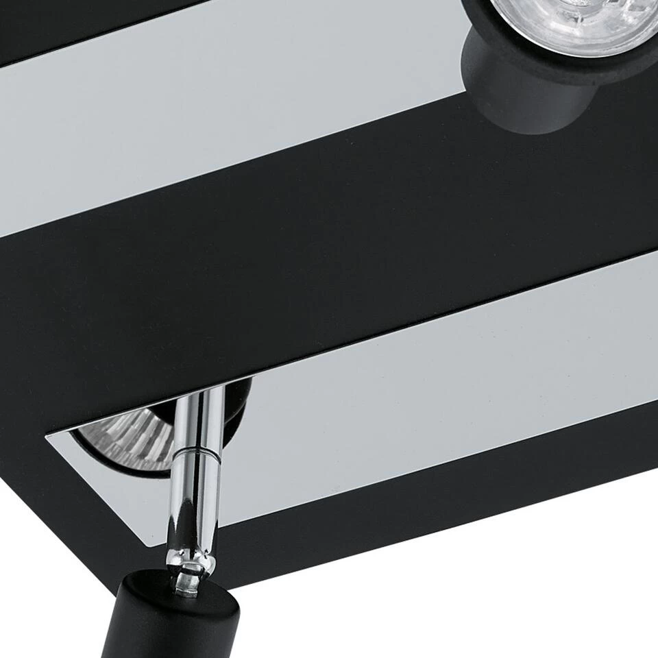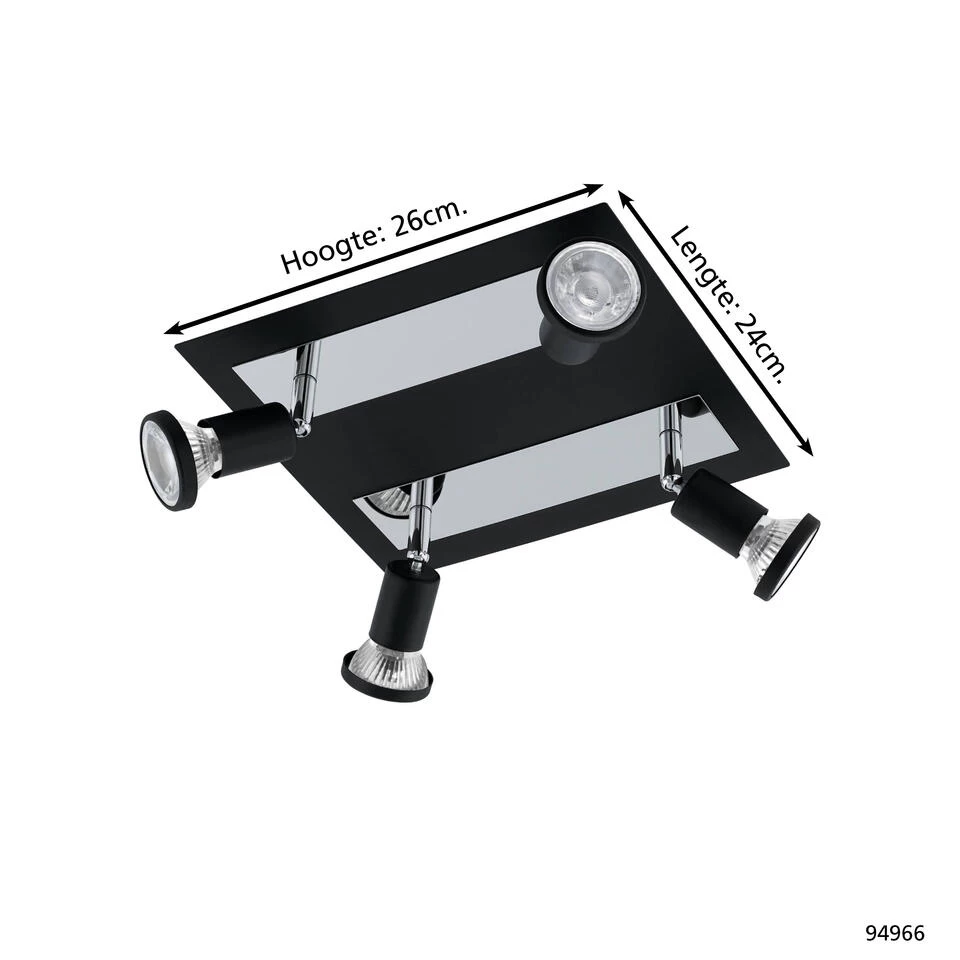 De EGLO Sarria is een spot gemaakt van staal. De spot heeft een zwart zijdeglans afwerking met spiegel details. De Sarria spotkoppen zijn gemakkelijk kantelbaar. Deze spot met GU10 fitting wordt geleverd inclusief LED lichtbronnen en is geschikt voor een maximaal wattage van 4X5W. De lamp geeft warm wit licht (3000K) en is niet dimbaar. Door het moderne design past de Sarria spot goed in en modern interieur.