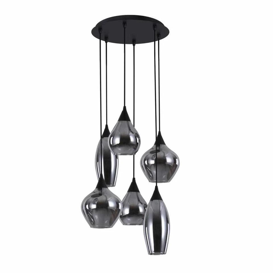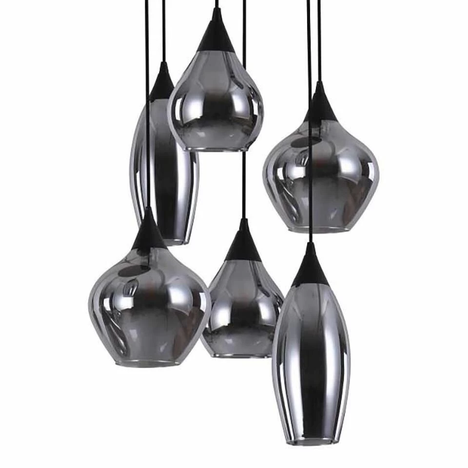 De Cambio hanglamp van leverancier Highlight is voorzien van 6 glazen die een rook kleurige coating hebben. Het glas van deze hanglamp heeft 2 gezichten: spiegelend chroom als de lamp uit is en grijs kleurig (smoke) als de lamp brandt. Deze lamp heeft 3 verschillende soorten kelken met een diameter van 12-20 cm en een hoogte van 18-25 cm.