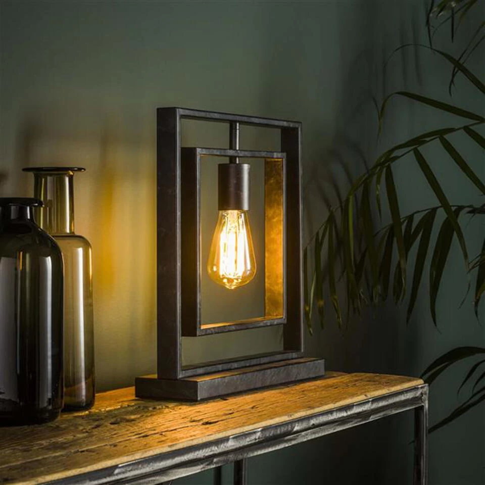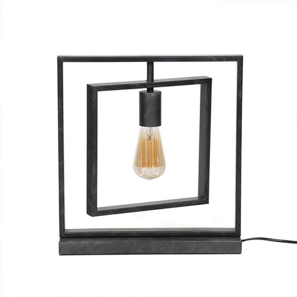 Deze industriële tafellamp Kody bevat één lichtpunt en is een vierkant model. De binnenste metalen vierkant is draaibaar en naar wens te verstellen. Deze metalen tafellamp is een echte eye-catcher in jouw woonkamer, slaapkamer of keuken.
