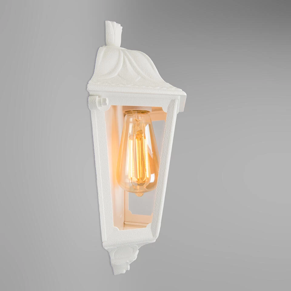 Klassiek en tijdloze buitenlantaarn. Uiterst geschikt als verlichting naast je entree, maar misstaat natuurlijk ook niet als tuinverlichting. De Lessie is uitgevoerd in wit en gemaakt van kunststof. De wand lantaarn heeft een hoogte van 35 cm en een lengte van 22 cm. Je maakt de lamp af met een lichtbron met een E27 fitting (max. 60 Watt), deze moet wel nog los bijbesteld worden. Ga voor een mooie filament LED lamp aangezien deze goed zichtbaar is voor de transparante ‘ruitjes’. De lamp is dimbaar met een externe dimmer (dimmer niet inbegrepen). Met zijn IP-waarde van IP55 is de wandlamp spatwaterdicht, perfect voor buiten! Met deze klassieke lamp Lessie voeg je echt een vleugje stijl toe aan je terras of je tuin.