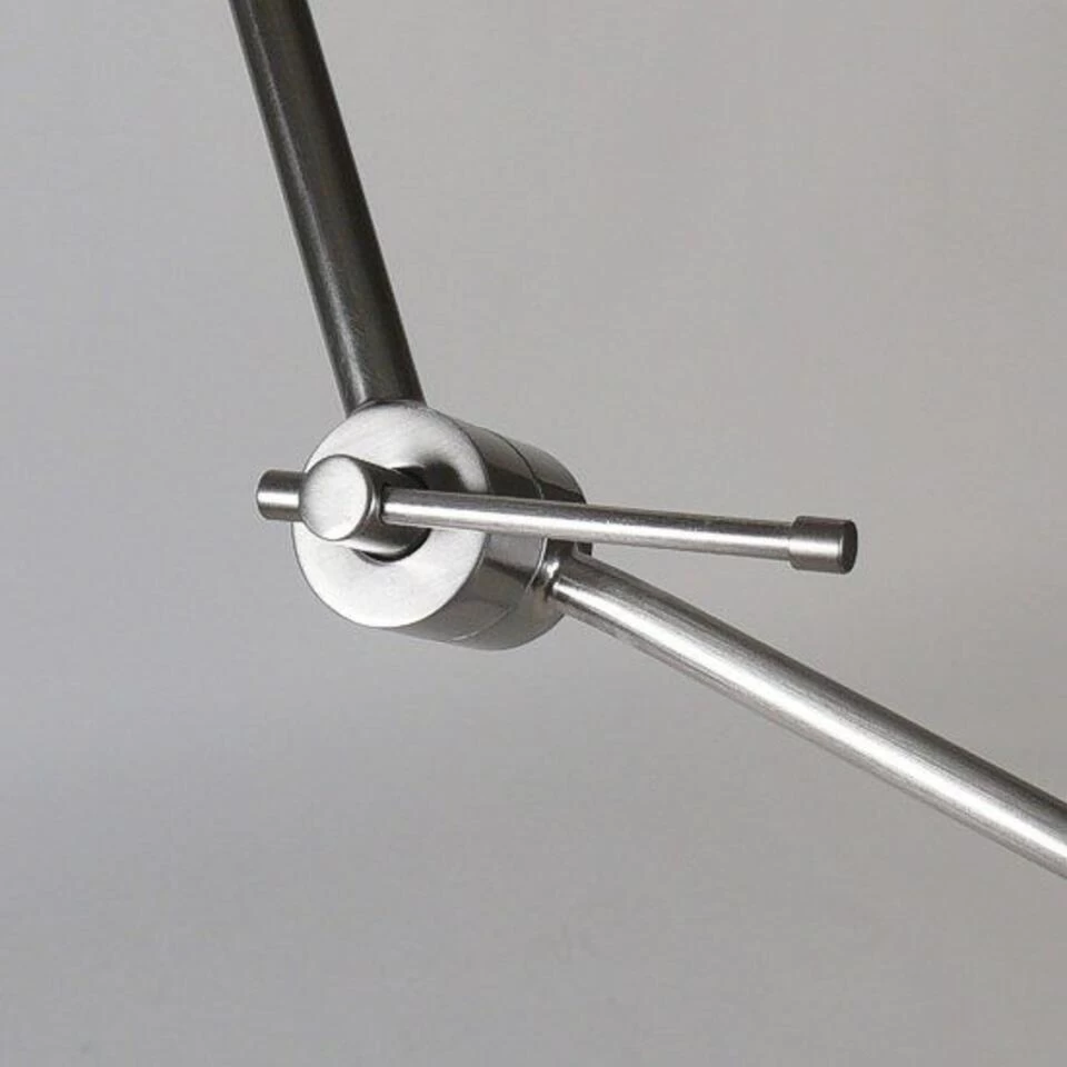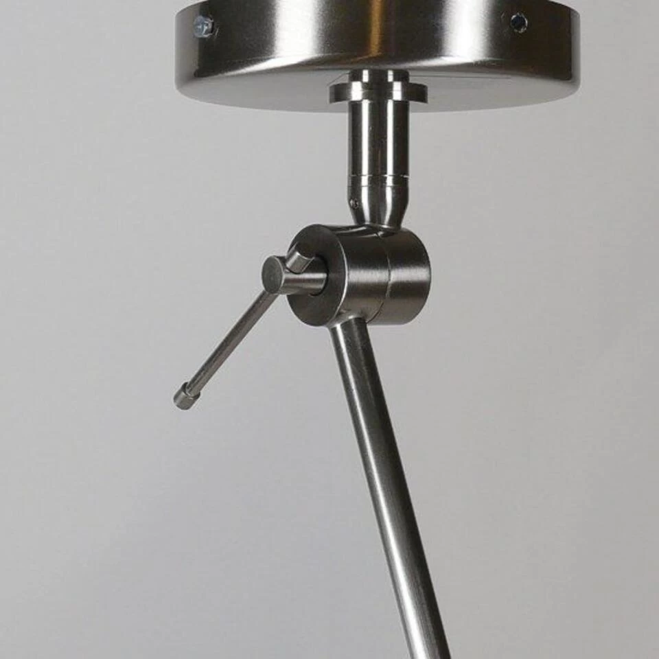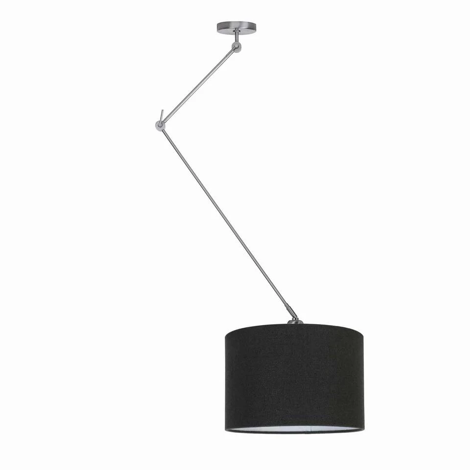 De eerste arm heeft een lengte van 37 cm en de onderste arm heeft een lengte van 74 cm. De armen zijn te knikken en vast te zetten met de stelschroef waardoor de arm niet meer door kan zakken. Bij de plafondplaat (diameter 12,5 cm) is de arm compleet rond te draaien. De zwarte stoffen kap is mooi afgewerkt en heeft een diameter van 40 cm en een hoogte van 25 cm. Het metaal is mat-chroom van kleur en dit armatuur is geschikt voor een lichtbron van maximaal 40 Wat E27 (excl.).